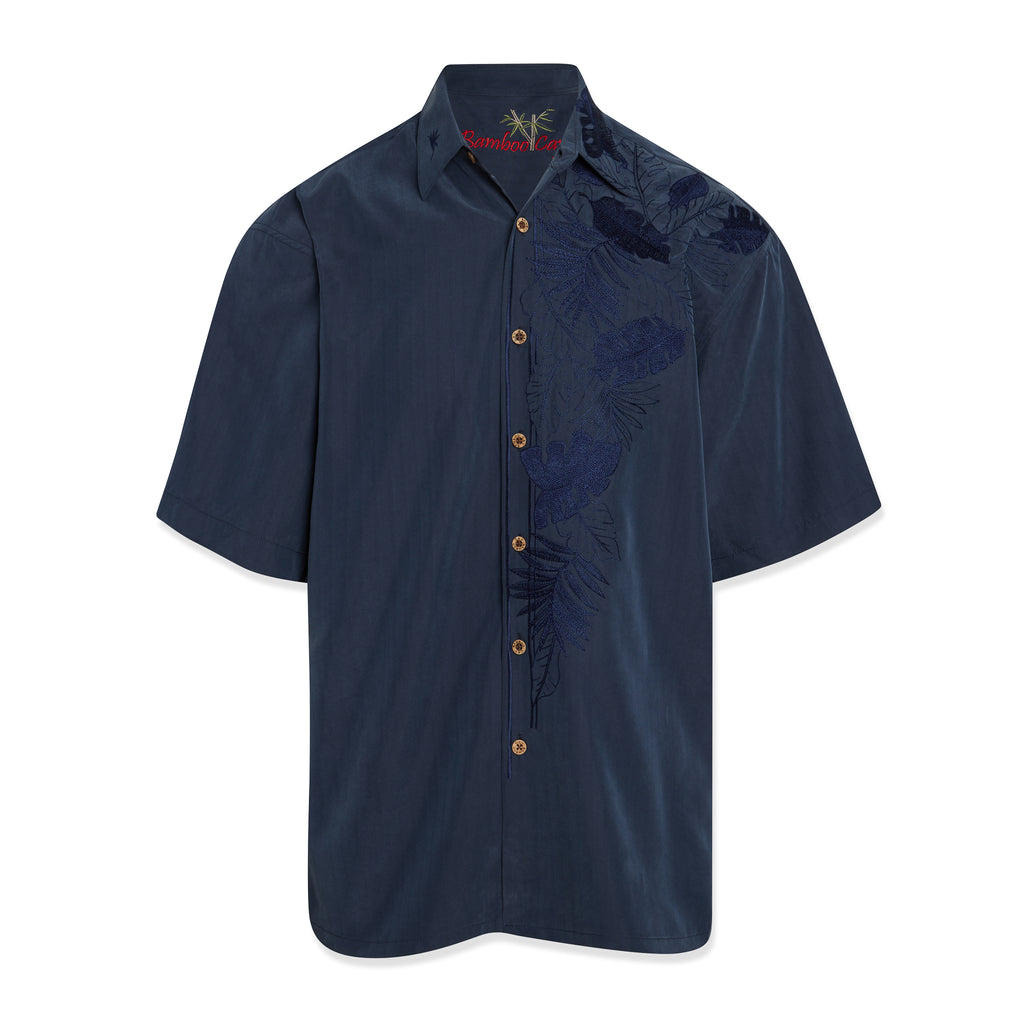 This short sleeve front embroidered shirt featuring a tonal floral embroidery coming from the wearer’s left shoulder top towards the bottom of the shirt. Very nice and subtle, this modal fabricated shirt has coconut buttons and a point collar. Bamboo Cay will get you noticed without drawing attention to yourself.