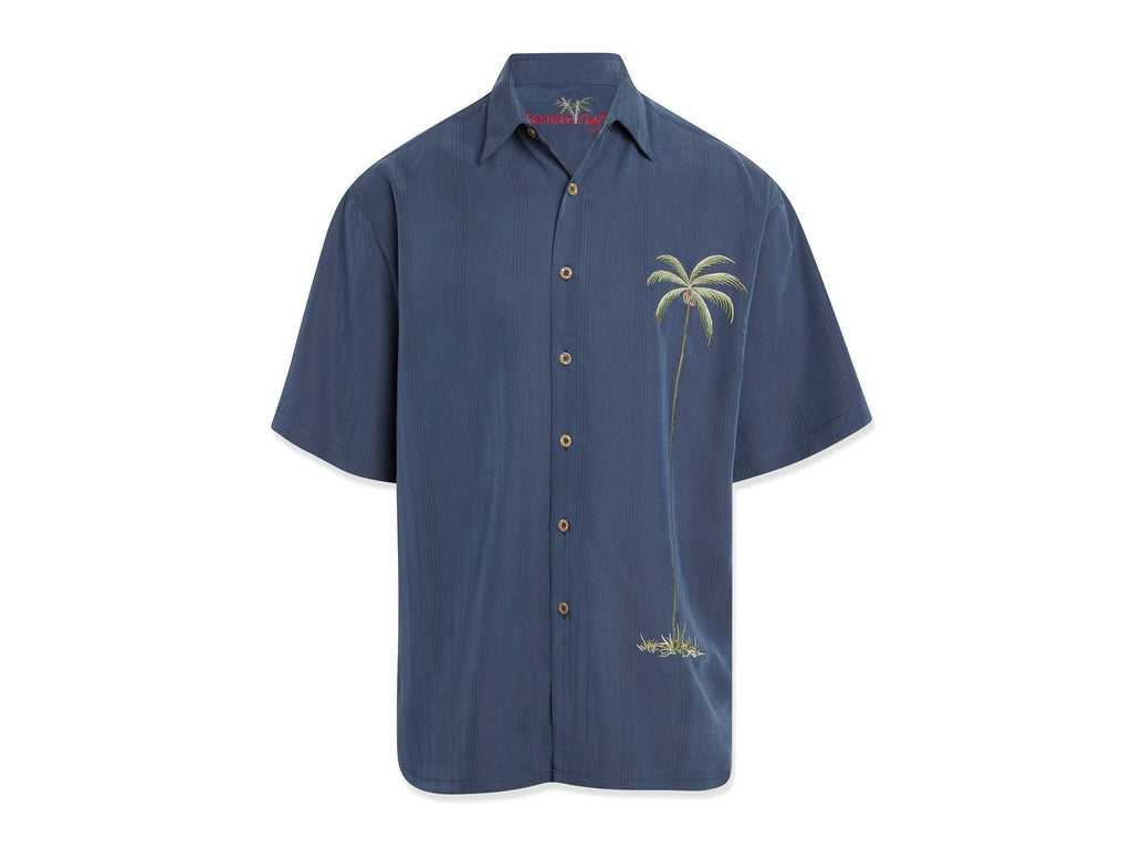 Bamboo Cay signature palm tree is embroidered on the wearer's left in a very subtle and simple yet elegant manner. Short sleeve camp shirt finished with a pointed collar, full-length front button closure, and a split hem, embossed on a soft textured imported modal fabric that is also machine washable. Bamboo Cay will get you noticed without drawing attention to yourself. Come along with us and enjoy relaxing Bamboo Cay fine resort wear for men, designed for comfortable living in your paradise. Our goal is to bring the island lifestyle into your daily life.