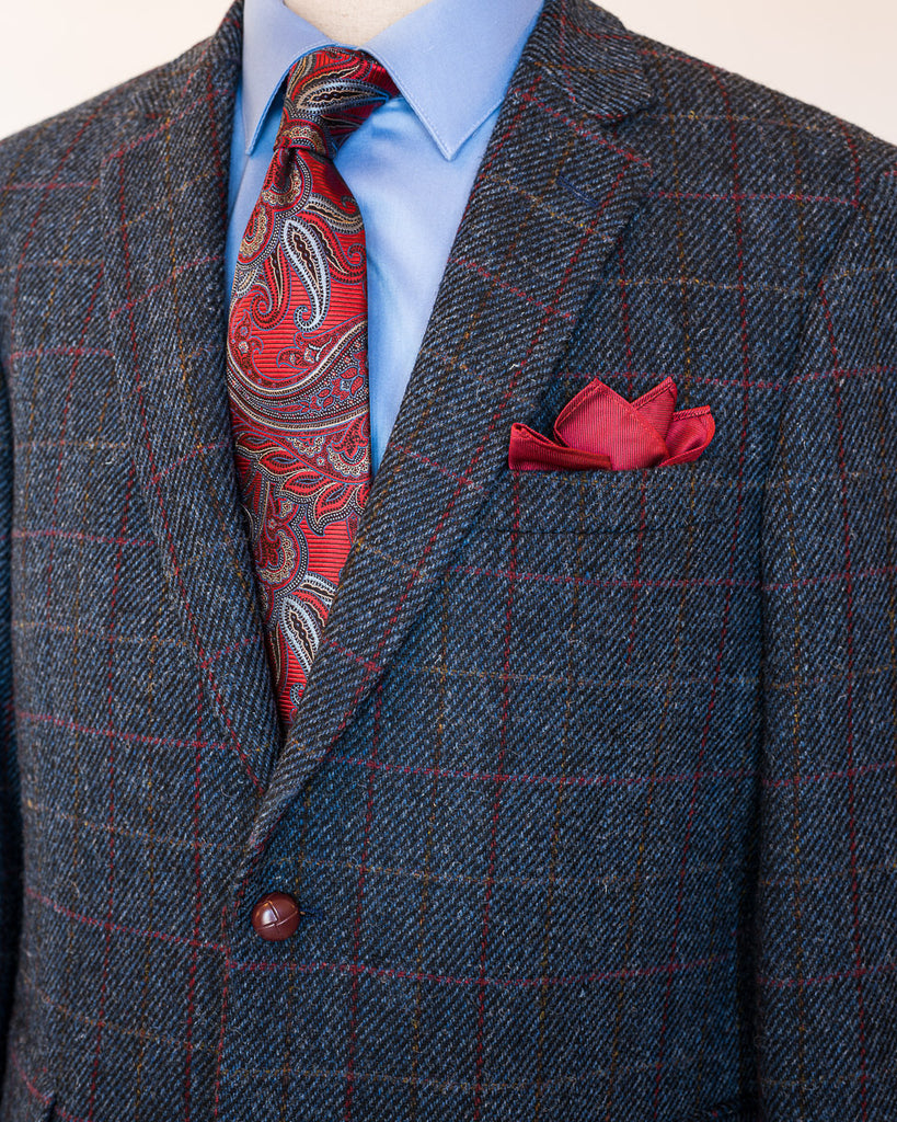 Crafted from genuine Harris Tweed handwoven in the Outer Hebrides of Scotland, this sport coat blends traditional craftsmanship with a rich and modern color palette. The Blue Windowpane pattern features deep navy tones accented with subtle burgundy and brown lines, creating a distinctive look that’s refined without being bold. Designed in a classic two-button silhouette with a traditional center vent, this coat includes genuine leather buttons for an elevated heritage detail. Made from 100% pure new wool, it provides durability, warmth, and the unmistakable character of authentic Harris Tweed. A versatile and distinguished piece—easy to pair with denim, chinos, or wool trousers.
